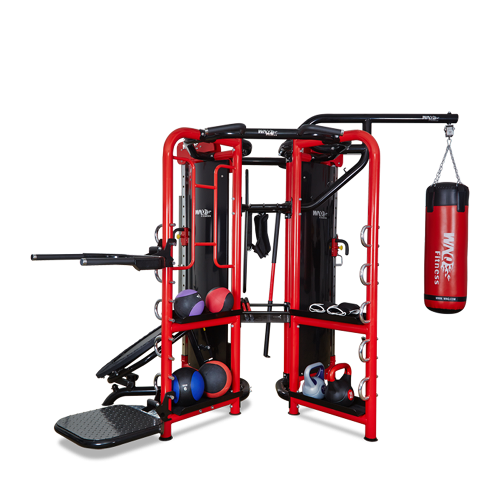 • 功能 可最少提供7人同时练习,10种以上的练习方式,以下只列出一些常用的练习项目:弹力球运动、拉力训练、二头肌训练、深蹲训练、平拉训练、双杆引体向上、沙袋拳击、踏板运动、吊绳、哑铃、壶铃等。